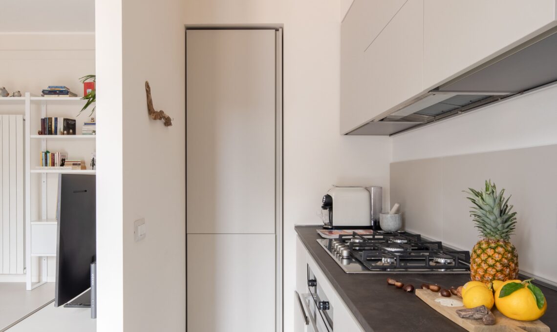In questo modo uno spazio limitato si è trasformato in ben tre ambienti distinti: ingresso con spazio per i cappotti, un soggiorno luminoso fruibile, e una cucina al tempo stesso riparata ma non claustrofobia, la percezione dello spazio adesso è completamente diversa.