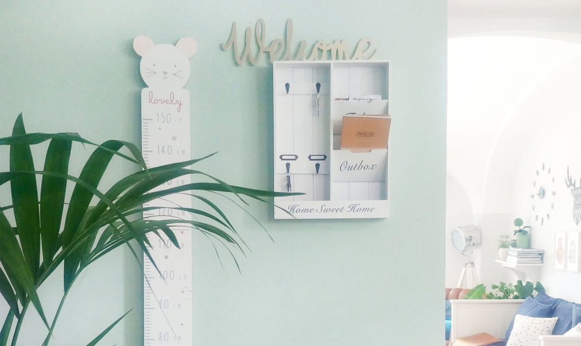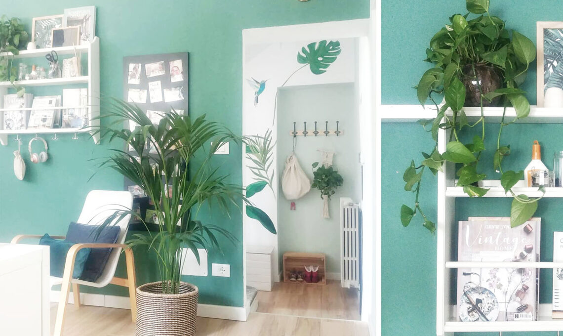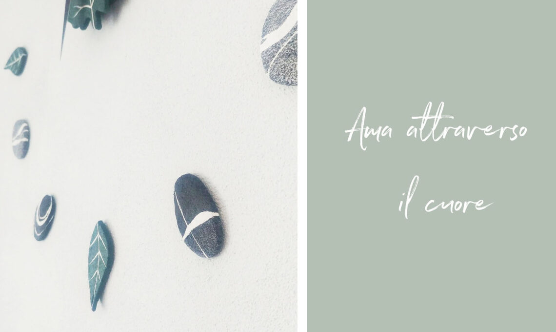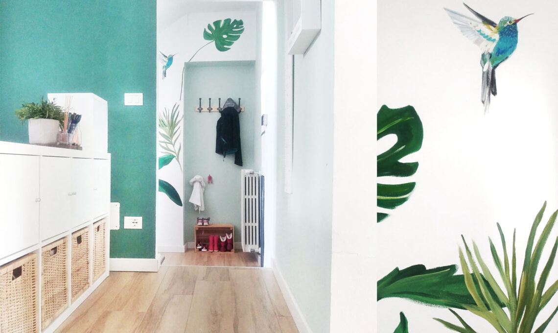 La zona di ingresso si apre in un piccolo corridoio che ho deciso di definire utilizzando il colore come trait d'union, il verde in tutte le sue sfumature ma non solo. Ho deciso di decorare le pareti con una rappresentazione grafica reale di alcuni elementi di tipo naturale. Così anche negli angoli di casa più lontani dagli spazi esterni la natura può fare visita.