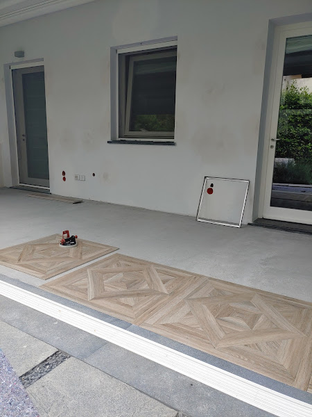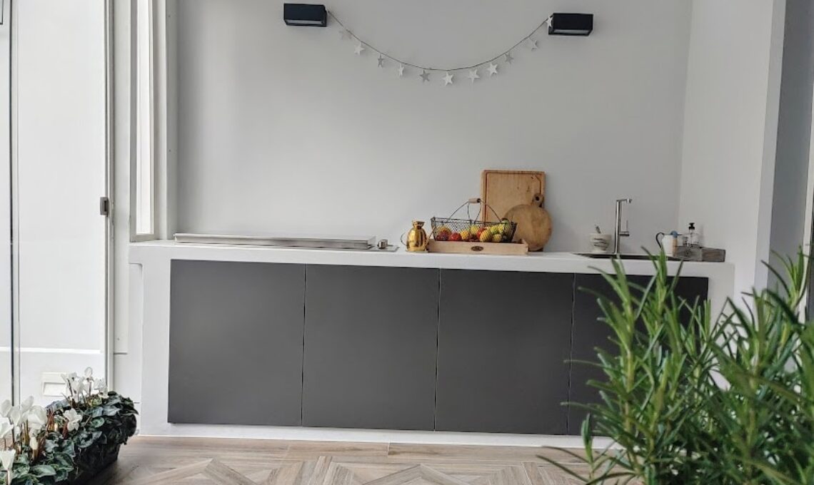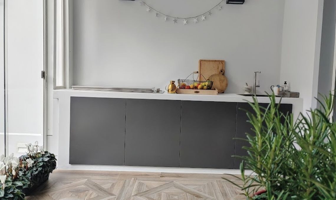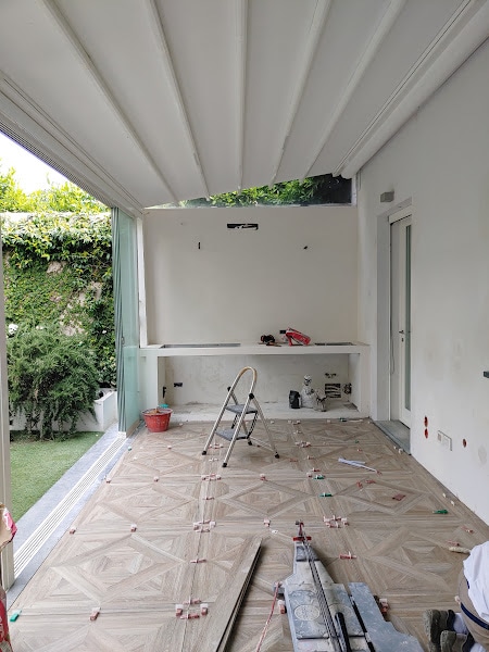 Per questo intervento i clienti mi hanno chiesto un totale rinnovo della loro veranda. Hanno richiesto eleganza, linearità e funzionalità. L'intervento è partito dal totale rifacimento del pavimento. Ho tolto il legno posato su struttura metallica, riempito il fondo con un massetto a livello delle soglie e posato un gres effetto legno. Le mattonelle formato 80x80 hanno una  disegnatura a quadrati  elegantissima di Sant'agostino. Un effetto raffinato che ha dato veramente risalto all'ingresso di casa. La cucina esistente presentava già dei muretti di costruzione, che abbiamo mantenuto. Sui quali abbiamo lavorato, costruendo una struttura contenitiva con ante in appoggio liscissime in grigio antracite a riprendere i colori della casa. Il piano e i muretti li ho lasciati in muratura dipinti in bianco con uno smalto resistente alle macchie, per dare un effetto ancora più pulito. Ho inserito un Barbecue della Fulgor in acciaio con coperchio piatto. Sulla zona cucina sono stati inseriti due punti luce sempre grigi antracite lineari con illuminazione verso l'alto e il basso. Un totale cambiamento dell'ambiente che ha reso più funzionale e comoda la stanza che ora i clienti usano anche durante l'inverno per le serate con gli amici.