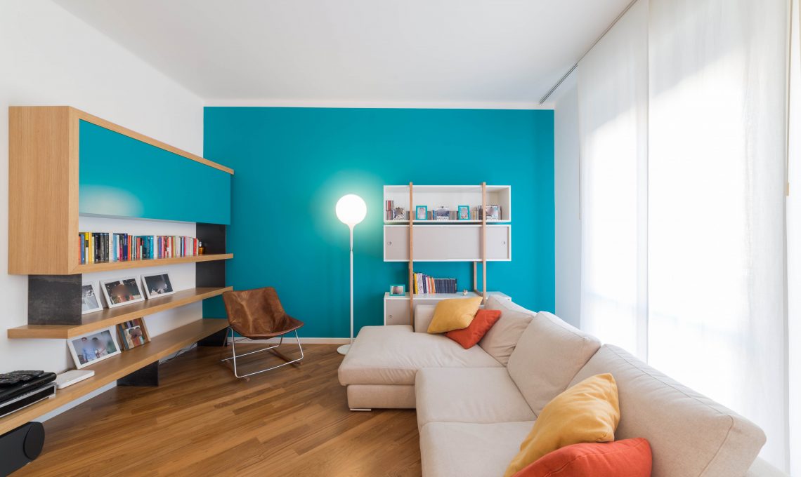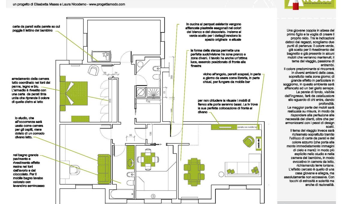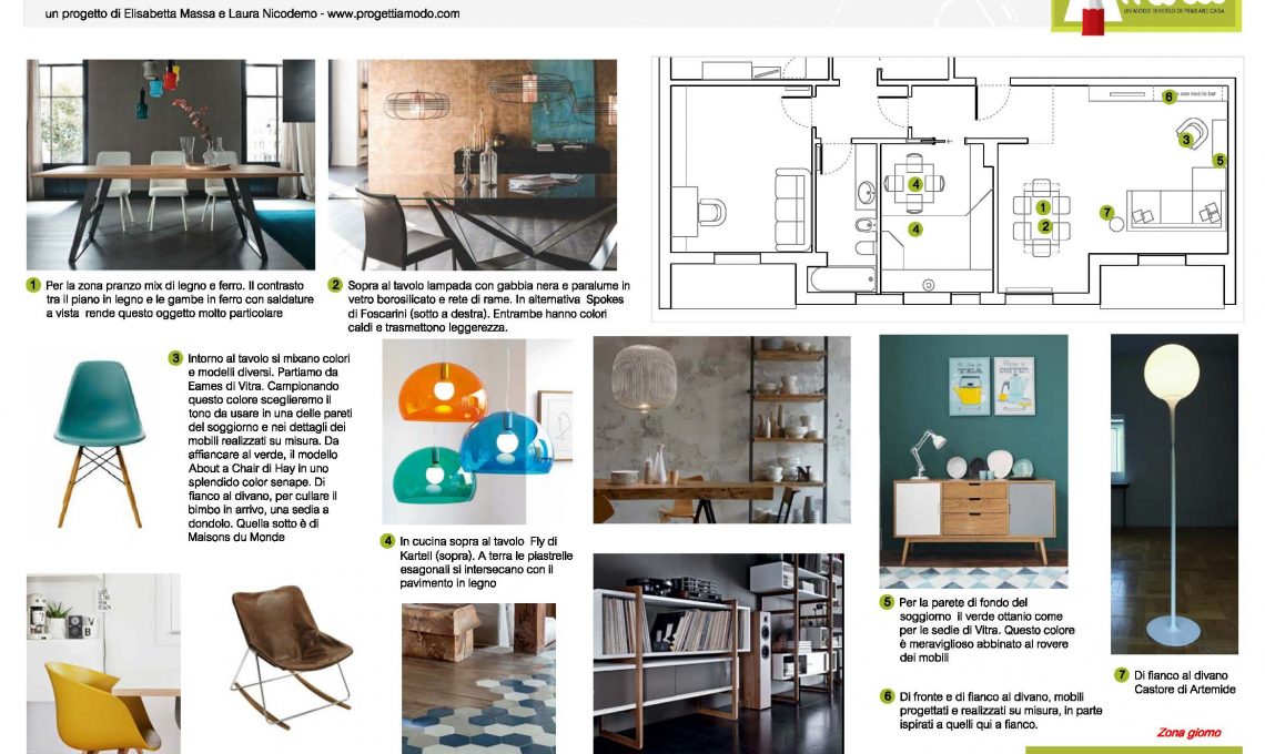 Il colore predominante, il verde, si rincorre in diversi ambienti della casa, soprattutto nella zona giorno; di grande effetto in particolare in soggiorno, in questo ambiente è affiancato ad un bel giallo senape. La parete di fondo, visibile dall'ingresso, fa da catalizzatore allo sguardo di chi entra, dando profondità.
