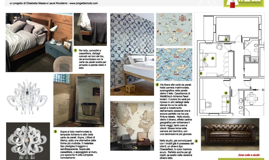 Il tema del viaggio è richiamato soprattutto tramite l'utilizzo di carte da parati e del colore azzurro. Questo infatti porta alla mente immediatamente immagini di cielo e mare. Il tema ricorre in modo più esplicito nello studio e nella camera del bambino, in modo evocativo in camera da letto, richiamando terre lontane.