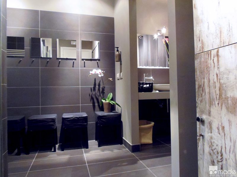 Gli accenti sono dati dagli elementi appositamente progettati per la palestra, in ferro grezzo cerato, a contrasto con il parquet scuro e le nicchie, rivestite in carta da parati stampata a mò di muro di mattoni.