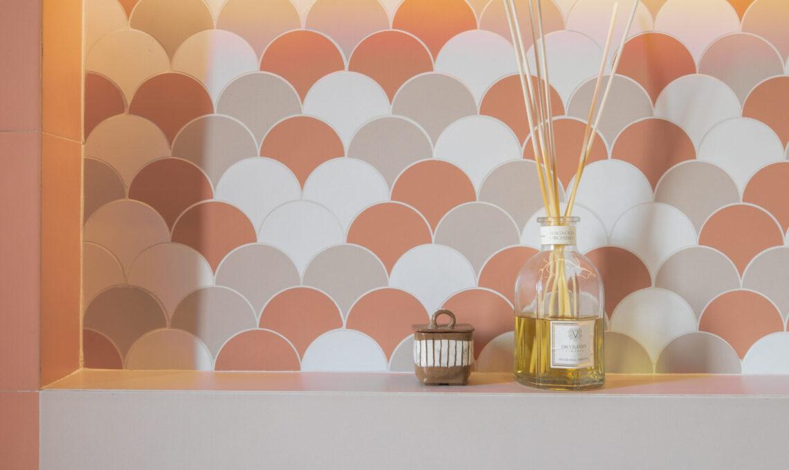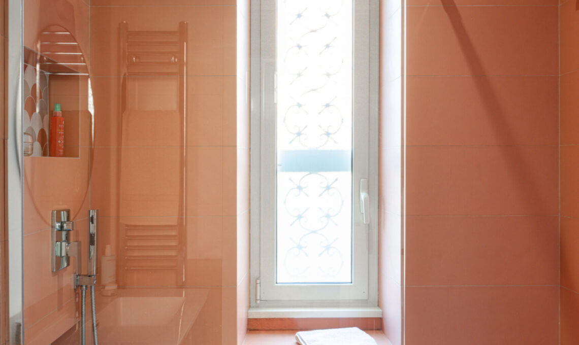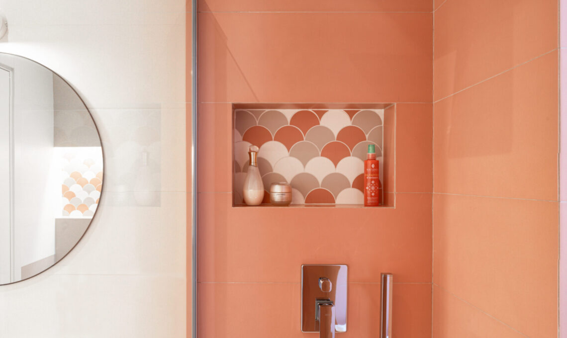 Il colore si sprigiona nel bagno, dove un color pesca illumina e vivacizza la casa, tinta richiamata anche piastrelle poste nelle diverse nicchie realizzate in bagno, le nicchie sono utilissime negli spazi piccoli, nono solo perché creano movimento e volume con poca profondità ma moltiplicano anche i piani di appoggio che con dimensioni ridotte è sempre utile.