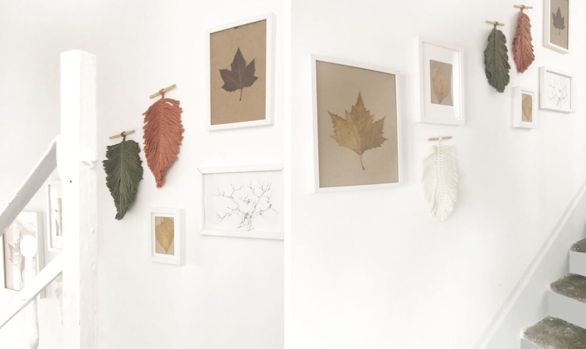 Abbiamo alternato cornici ad altri elementi decor, perché una wall gallery d'effetto porta sempre con se un insieme di elementi diversi tra di loro. Noi abbiamo scelto di esporre un'illustrazione realizzata a mano in bianco e nero, riportante sempre un'immagine naturale, e alcuni elementi decor realizzati in macramé a forma di foglia.