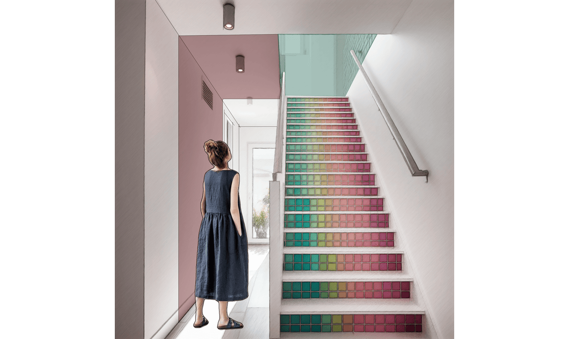 Come decoro per la scala Decorare l’alzata è un’occasione di decoro che molti sprecano ma che in realtà rappresenta un buon modo di valorizzare un fronte senza caricare le pareti, catturando tutta la luce possibile dall’alto. In questo caso i colori adoperati per il rivestimento dell’alzata sono poi ripresi nell’interno ma non sulla scala che resta chiara.