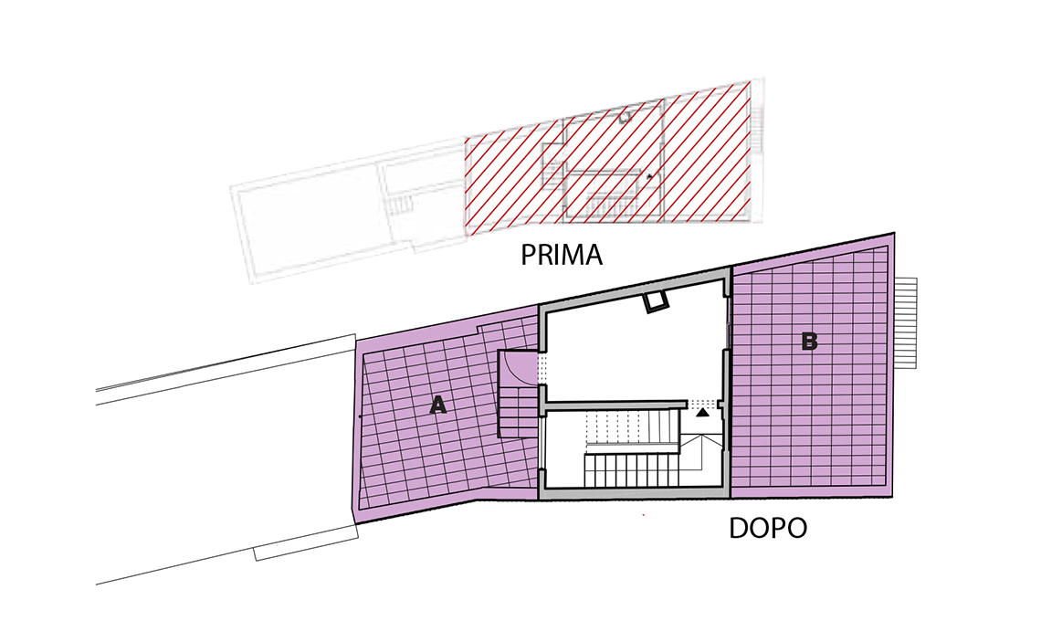 lastrico solare, piano (53 mq): dal blocco scale sopraelevato si accede a un disimpegno che porta al primo terrazzo (A) su fronte strada e a un secondo terrazzo (B), posto a un livello più basso, affacciato sul patio. Entrambi sono spazi comuni utilizzati per prendere il sole durante il giorno e per organizzare piacevoli cene estive di sera.
