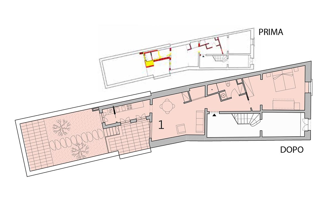 A piano terra c’è l’appartamento 1 (65 mq): l’ingresso divide le zone notte (camera matrimoniale con terzo letto) e giorno (area relax e pranzo). La cucina
