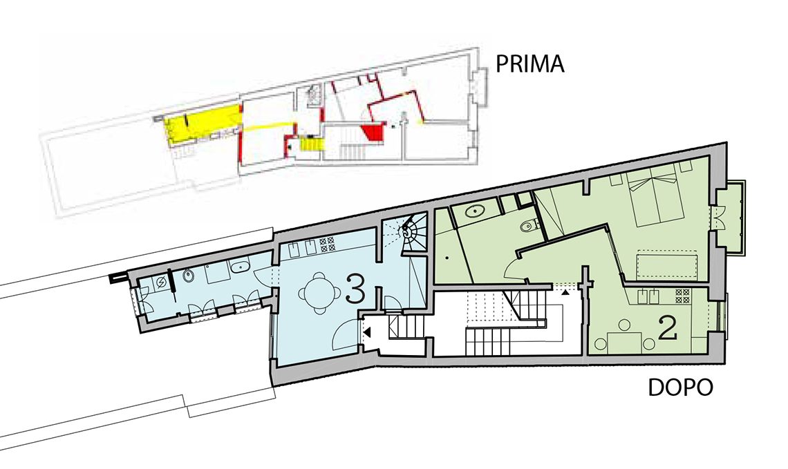 strada, è di 46 mq. La stanza matrimoniale ha terzo letto e cabina armadio, il soggiorno ha la cucina a vista; nel bagno ora c’è una maxi doccia. Accanto (azzurro) c'è il piano di ingresso del duplex 3: affacciato sul patio, si sviluppa su due piani. Al primo livello ci