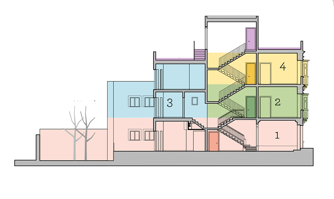 IL PROGETTO: la casa aveva, in entrambi i piani, una camera da letto su strada, un soggiorno senza finestre al centro, più cucina e bagno sul patio. Prima di tutto, la ristrutturazione ha previsto la riapertura delle vecchie arcate presenti tra la zona notte e quella intermedia, in modo da portare la luce che entra dai bay-window verso le zone più buie, dove ora sono posizionati i bagni. Il blocco scala serve tutti gli appartamenti che, da progetto, si sviluppano con 3 piante diverse.