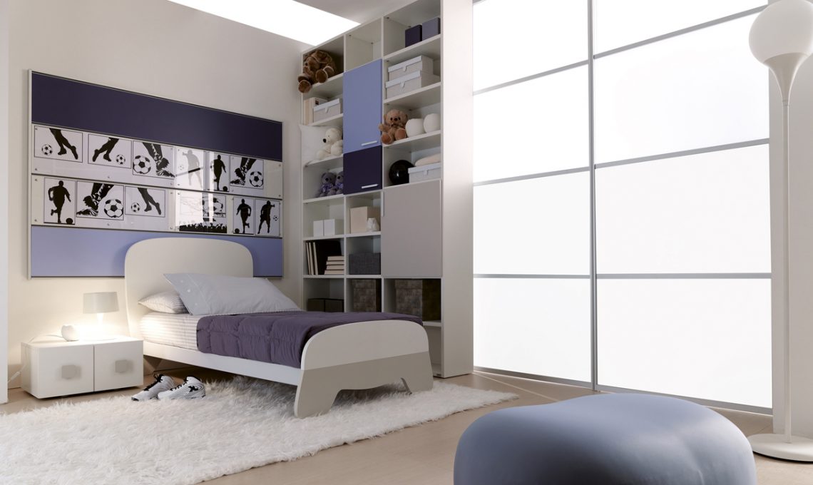 Due stanze in una con le librerie Over (cm 167,8x36,2x258,8h) più la porta scorrevole Anta Magica da cm 120x270h. Per il bebè: lettino trasformabile con 2 cassettoni (cm 190x96x98h) e boiserie [Doimo CityLine].