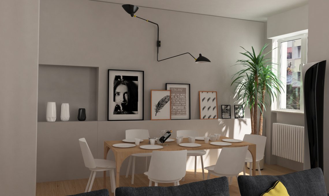 Effetto open space: prima la cucina era troppo ampia e totalmente separata dal salotto. Ora è praticamente parte del soggiorno poiché la divisione dal living si ha grazie a 2 grandi aperture da chiudere con ante scorrevoli in vetro, che permettono alla luce di passare ugualmente.