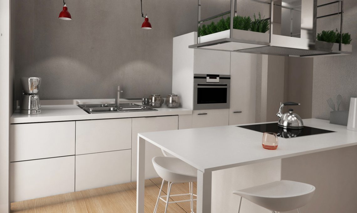 La cucina è più compatta e pratica: al centro, parallela alla parete con lavello più colonne frigo e forno, c’è una grande penisola con la zona cottura e banco snack.