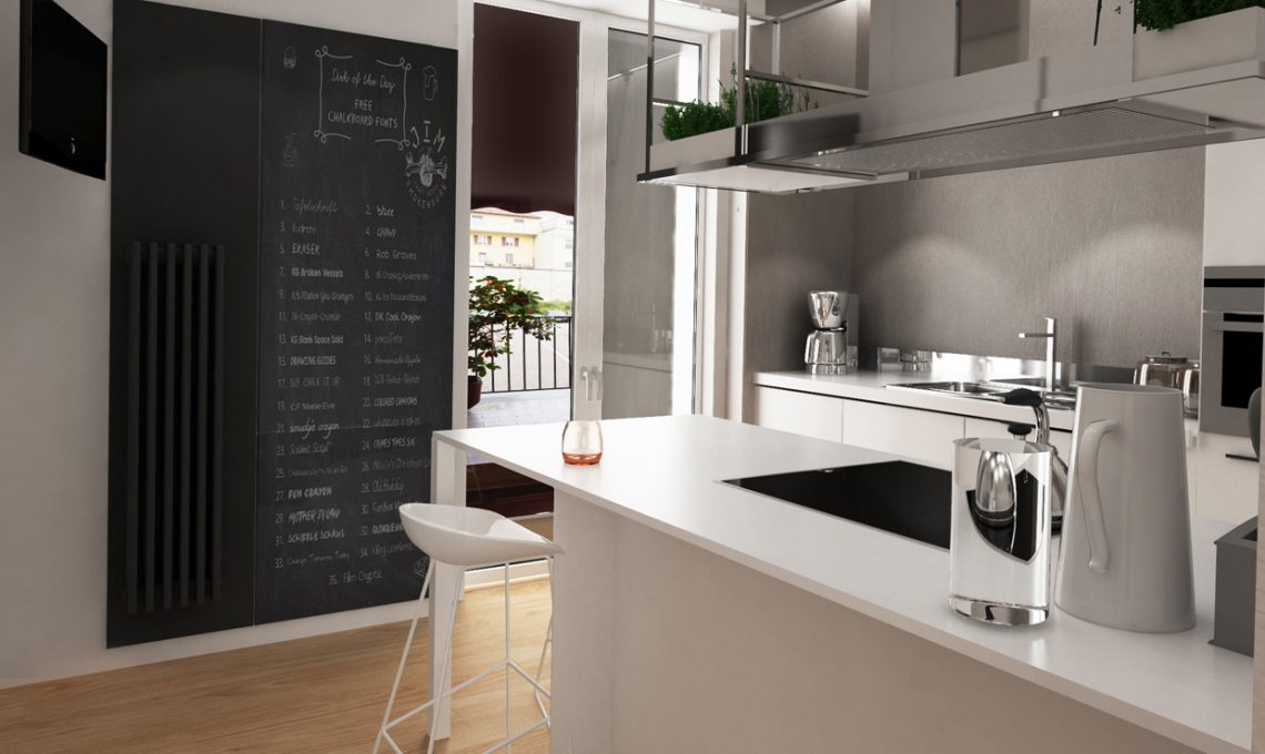 In cucina accanto alla finestra si trova una nicchia chiusa da un’anta rivestita con una lamina magnetica effetto lavagna di [Abet]. Parete e calorifero sono dipinti nello stesso colore.