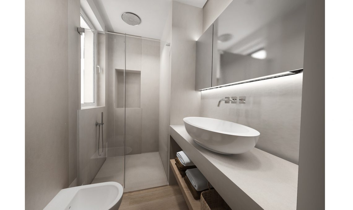 Le pareti del bagno sono rivestite con la resina Wallcrete di [Kerakoll], dalla texture cemento materico spatolato. Ideale anche per la doccia se addizionata con l’impermeabilizzante Aquastop.