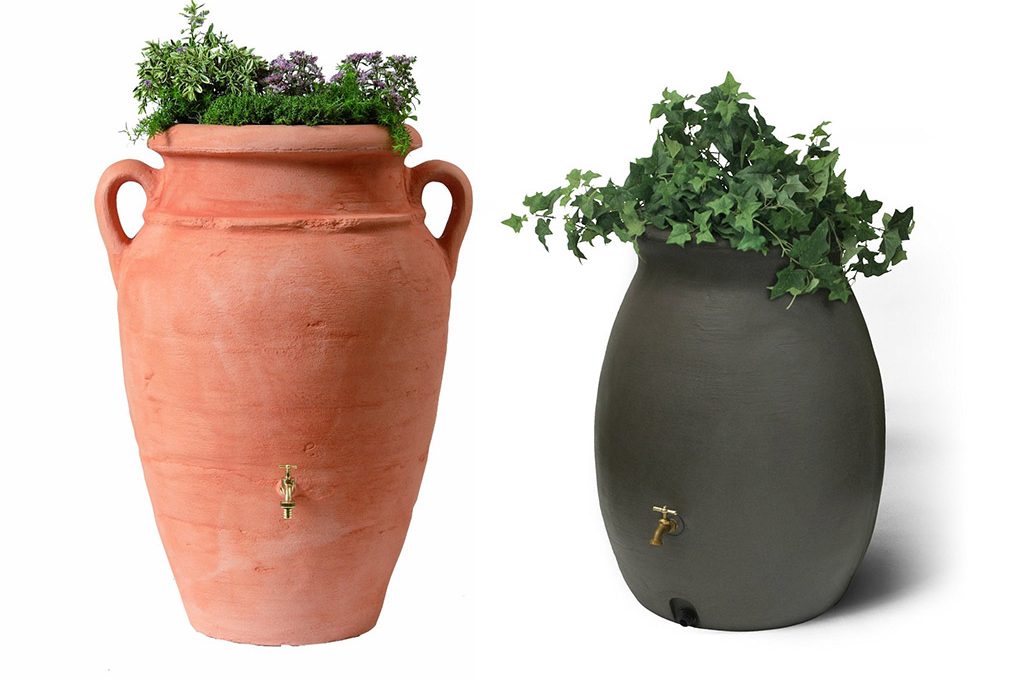 Contenitore per acqua piovana da 360 litri Anfora Antica, con portavaso e rubinetto integrati [Graf, cm ø 88x120 da €353]. Serbatoio a conca Castilla, da 190 litri, è dotato di rubinetto e portavaso [Algreen, cm ø 58x84 da €91].