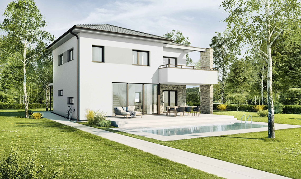 Ritmata da volumi netti e sfalsati, la villetta contemporanea ha la struttura portante in legno ed è isolata con materiali naturali come il sughero e la fibra di legno [Rubner Haus, su progetto].