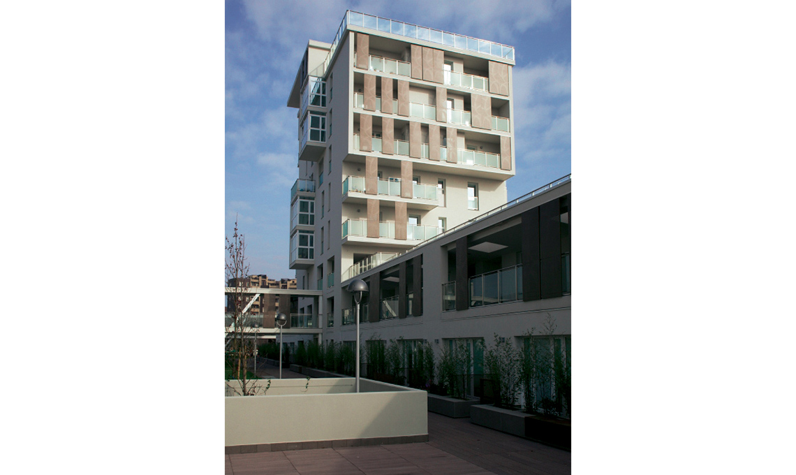 a Milano, comprende 4 torri da 9 piani, tutte realizzate con pannelli portanti in legno realizzate con il sistema X-Lam [DecimoPrimo].