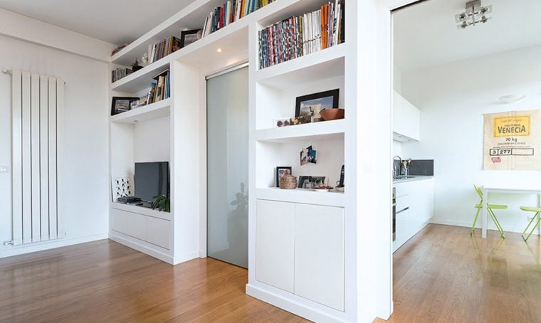 - Al primo piano i proprietari avevano la necessità di ricavare una cucina che avesse le dimensioni adatte ad ospitare l’arredo della loro precedente abitazione. L’area pranzo è stata quindi collocata esternamente alla cucina ed ospita anche una piccola area soggiorno, con divano e tv, più raccolta rispetto a quella del piano terra ed anche questa con accesso all’esterno su un terrazzo. Allo stesso piano è stato anche ricavata anche una camera ospiti ed un bagno con vasca.