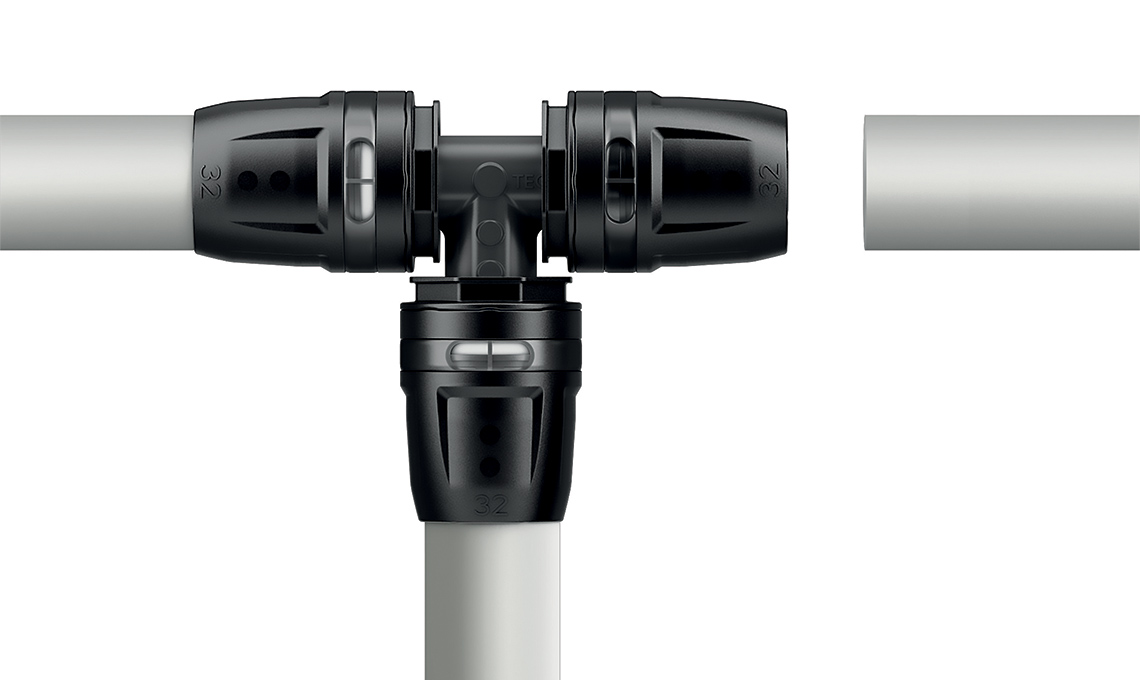 Per pose speedy Addio a tubi e ad attrezzi pesanti per il taglio e la pressatura che rendevano lunghe e complicate le fasi di posa... Oggi, con i tubi performanti multistrato e i raccordi a innesto rapido TECElogo, ci vuole davvero un attimo a ottenere collegamenti precisi e a tenuta ermetica, che permettono all’installatore di usare semplicemente le mani [Tece Italia].