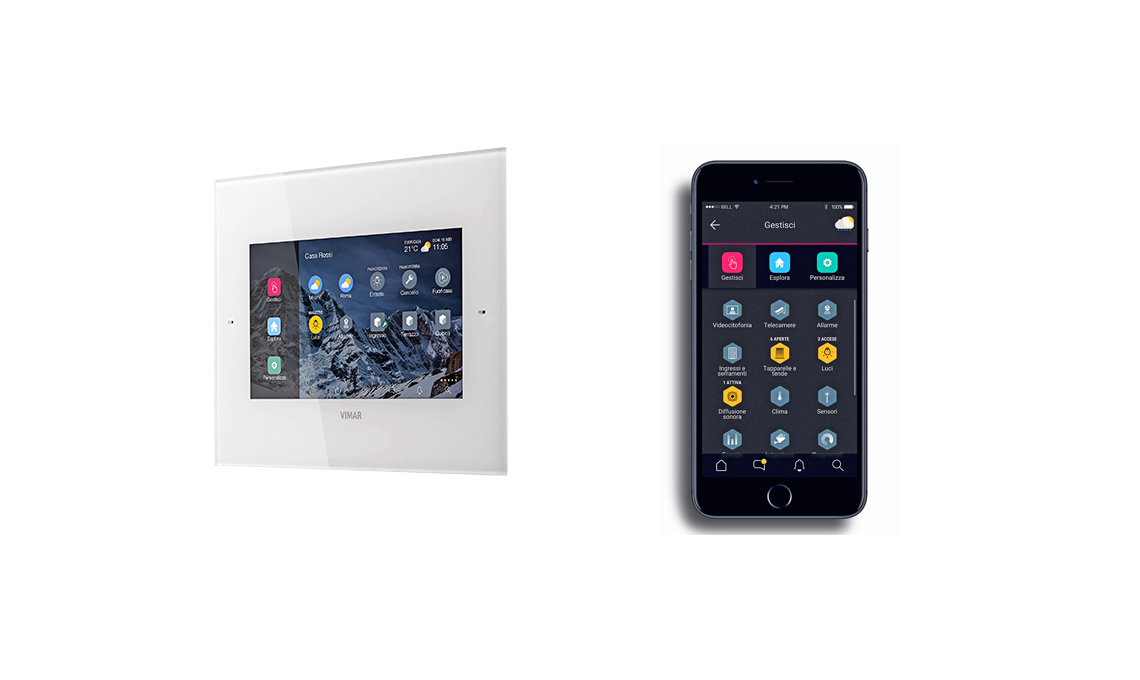 Livello 3. Tutte le funzioni presenti nella casa possono essere gestite sia dal Touch Screen da 7 pollici sia dalla App dedicata [Vimar, cm 21x16 € 921].