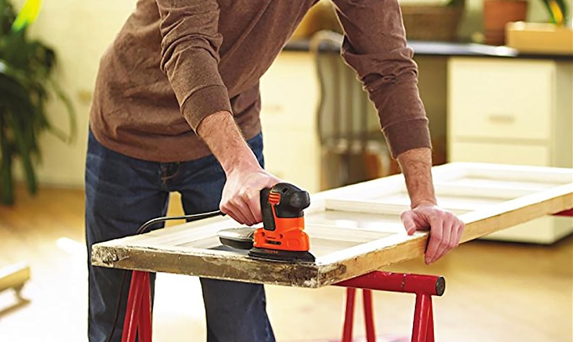1. SFILA la porta dai cardini, appoggiala su due cavalletti e carteggiane la superficie con la levigatrice elettrica a base triangolare, precisissima anche negli angoli.
