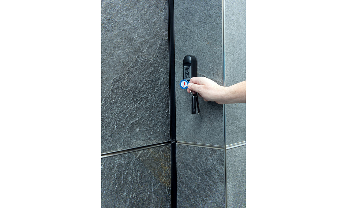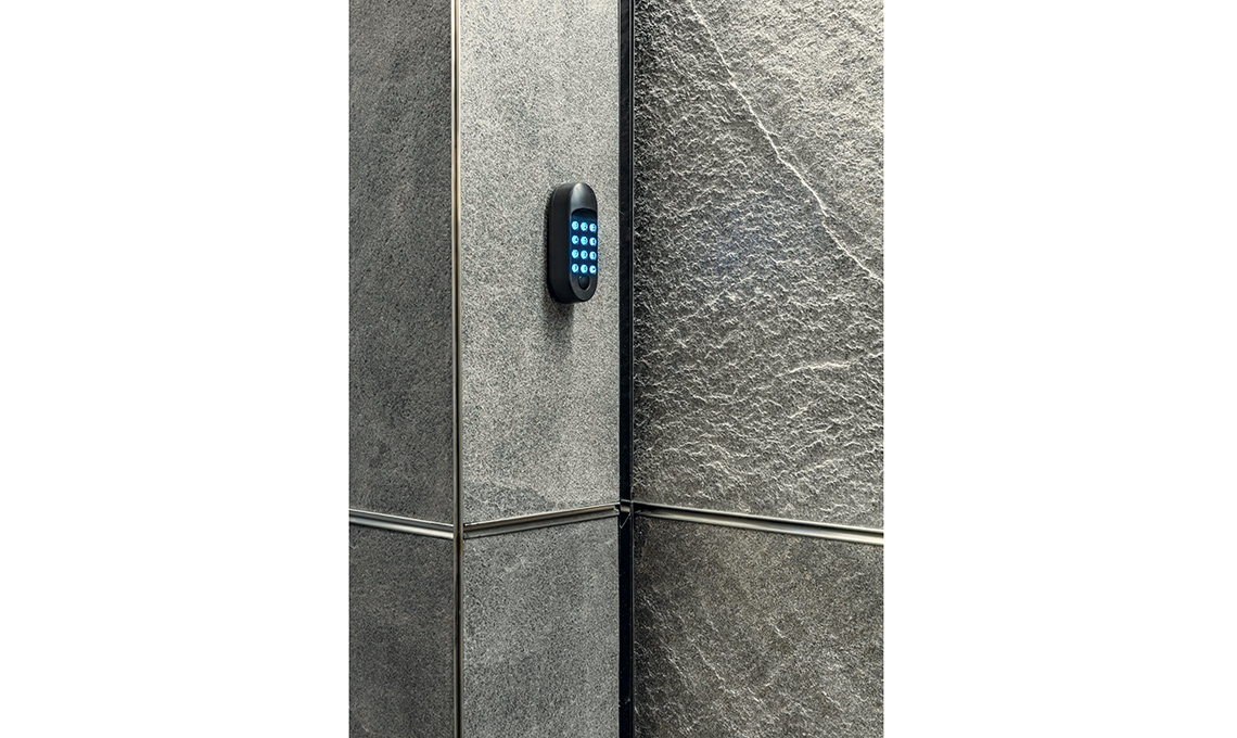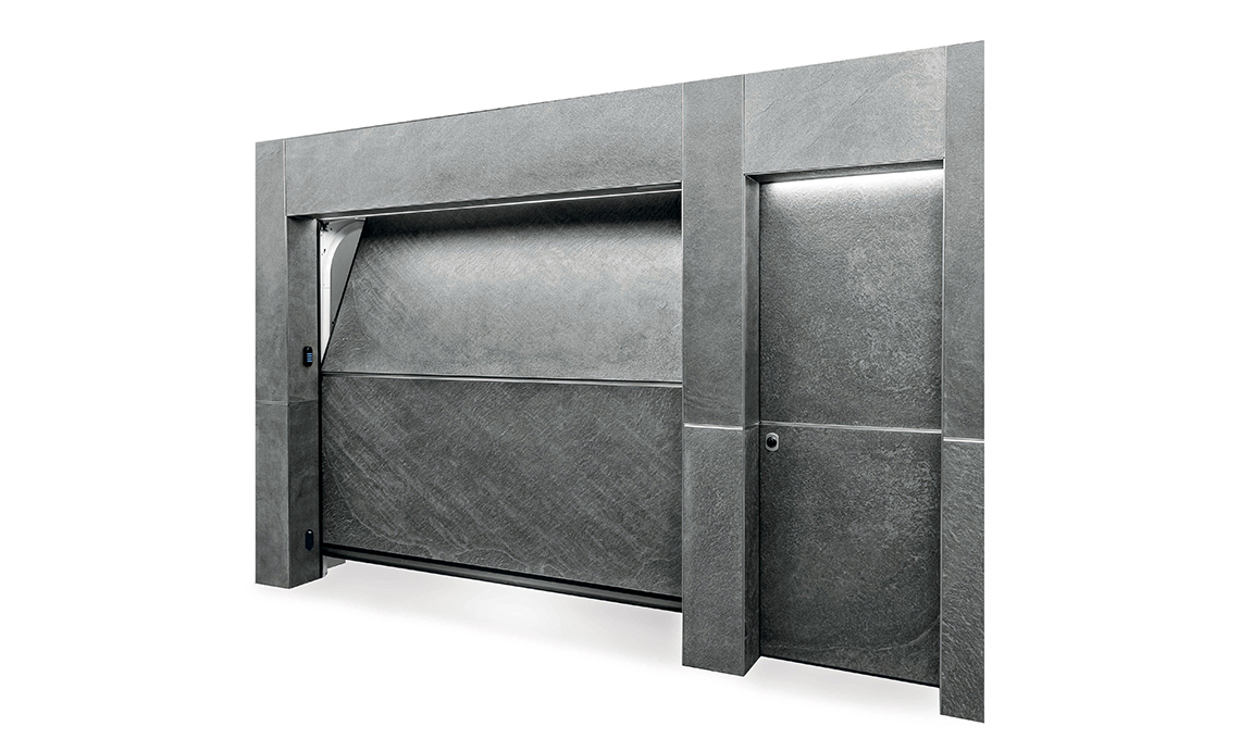 Il portone aprendosi verticalmente e scorrendo verso l’alto su guide parallele alla parete, a fine corsa si posiziona al soffitto, lasciando più spazio libero a disposizione, anche esternamente al box. Un esempio? Porta in Pietra di Ballan è il perfetto portone sezionale da box tecnica, funzionalità e più spazio libero ed è abbinato anche a una prestigiosa porta d’ingresso blindata. Un doppio ingresso protetto contro le intrusioni da una tastiera a codice numerico e un lettore badge, cablati. E il rivestimento? È in sottilissime lastre di vera pietra ardesia (disponibile anche in pietra mica), trattata con un’eco-soluzione idro-oleorepellente.