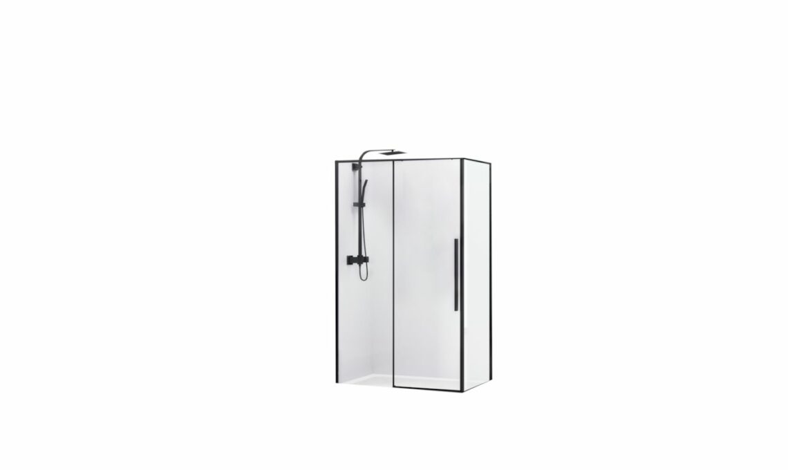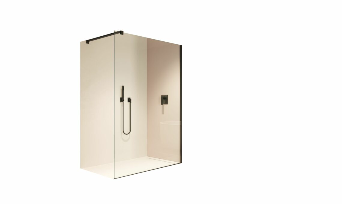 La parete Modula MR-1 con maxi lastra doccia in vetro trasparente temperato di sicurezza spessore 8 mm ha il profilo lungo la parete e in braccio di sostegno in finitura nero matt [Provex, cm 120x200h €880].