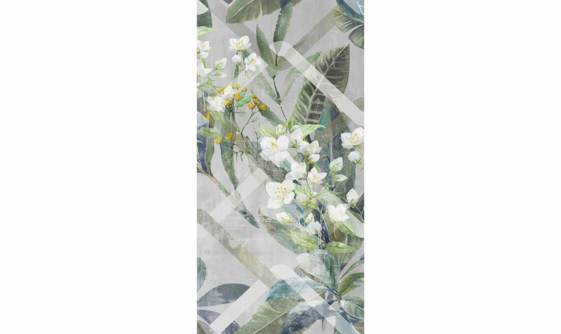 Gruppo doccia collezione 40 mm in finitura PVD Bronze formato da soffione, monocomando con deviatore e doccetta [Treemme €2.625]. Lastre in grès Glam Hedge [Panaria].