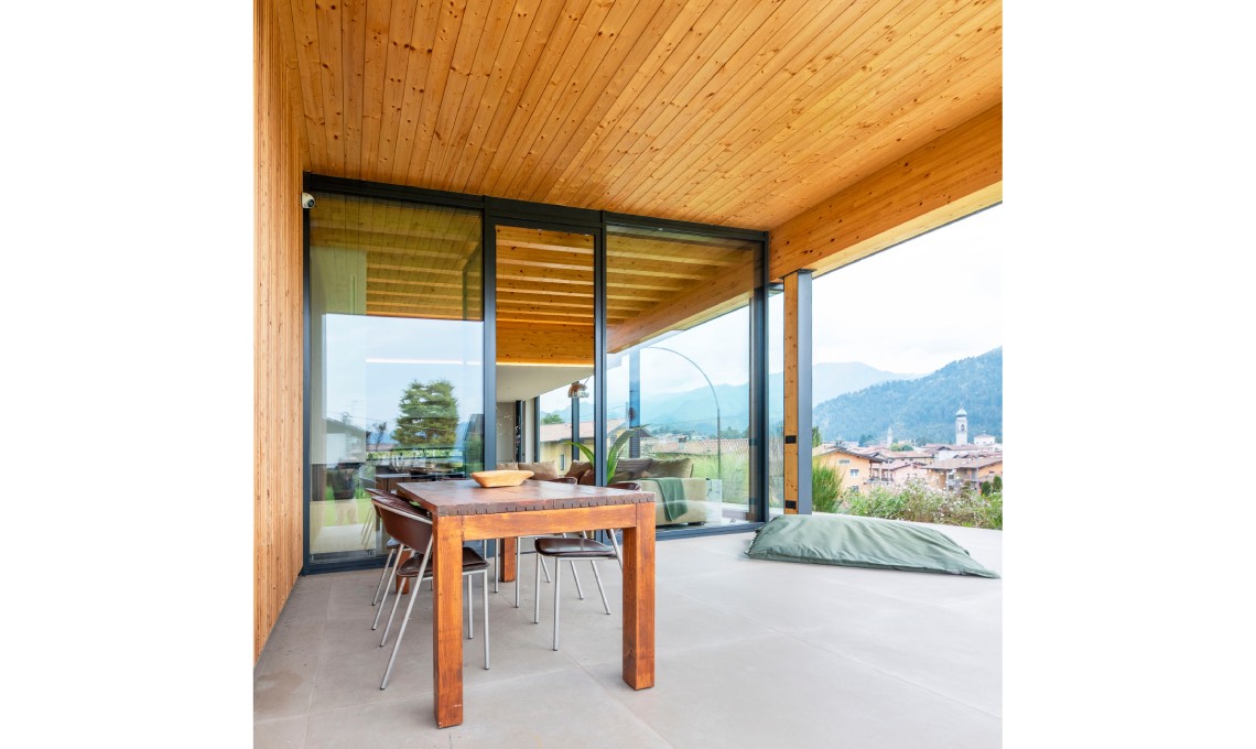 La casa si sviluppa su due livelli, seguendo l’andamento naturale del terreno: al piano principale c'è la zona giorno affacciata su un grande terrazzo, mentre la zona notte mansardata è pensata come un rifugio più intimo e raccolto. Le grandi vetrate sono uno degli elementi chiave del progetto: lasciano entrare la luce, aprono lo sguardo sul panorama e mettono in comunicazione interno ed esterno. Gli ambienti sono ariosi, pensati per muoversi liberamente e per vivere la casa senza barriere.