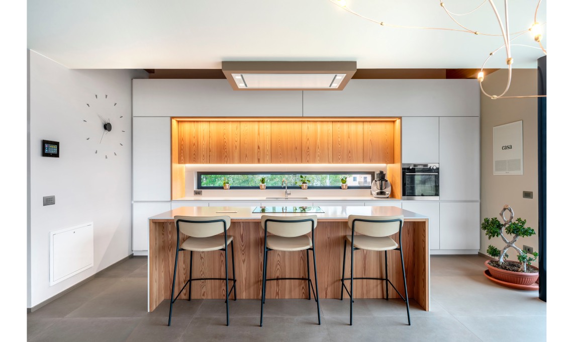La cucina ha linee pulite e una grande isola impreziosita dal rivestimento in legno. Grazie al sistema domotico By-me Plus di Vimar si possono controllare anche i consumi energetici e i carichi dei singoli elettrodomestici.
