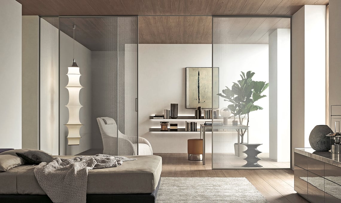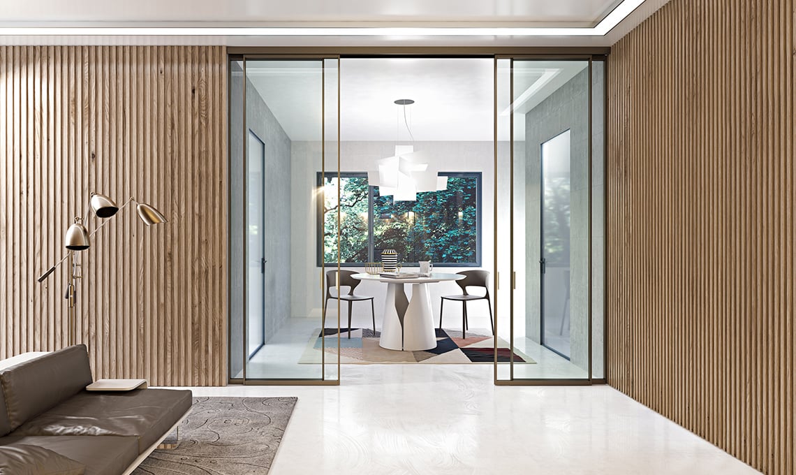 Le maxi-ante che formano la porta (e che possono sostituire una parete e darti la possibilità, da aperte, di avere un vero open space) si aprono sovrapponendosi le une sulle altre e scorrendo all’interno del ‘vano porta’ (che in gergo tecnico, si chiama ‘luce’). Le ante si muovono in modo silenzioso, rendendo dinamico il passaggio.