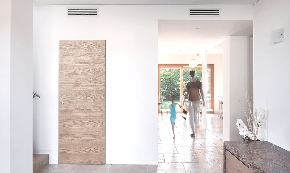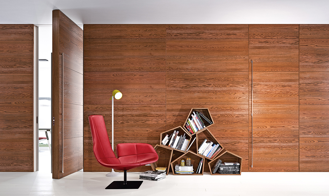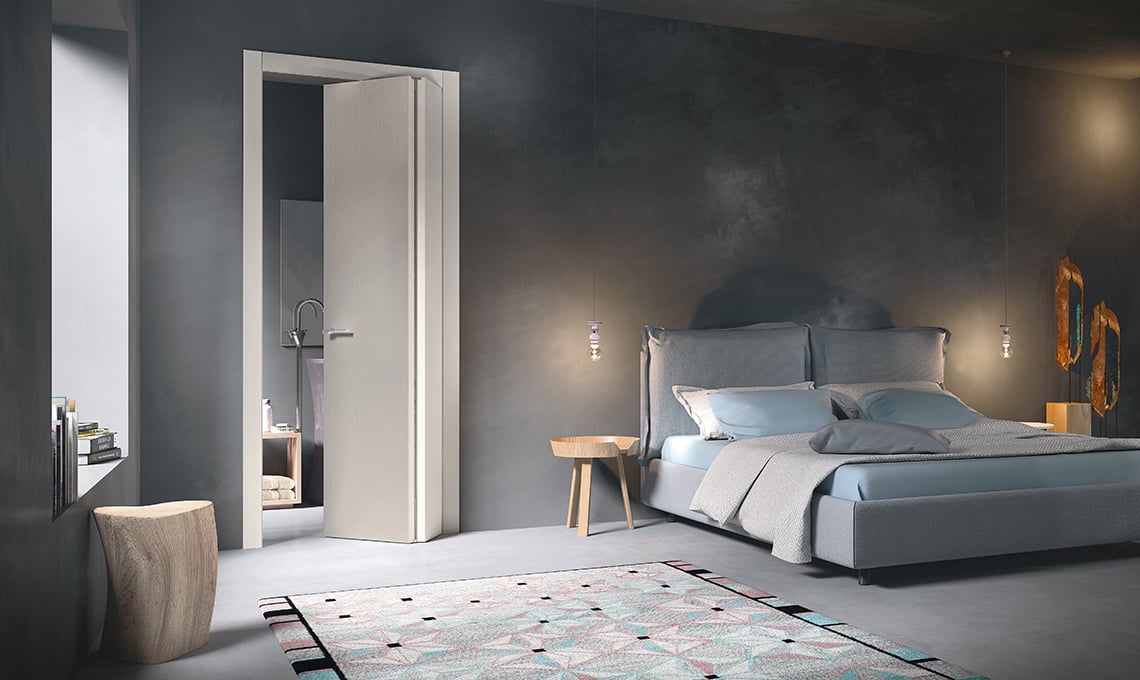 Con perni a scomparsa (pivot) installati alle estremità superiore e inferiore dell’anta, la porta a bilico si posa a filo del muro e si apre girando su se stessa, creando un’apertura ampia e scenografica. È perfetta per realizzare soluzioni a tutta altezza che, aperte, ‘tagliano’ un varco nel muro.