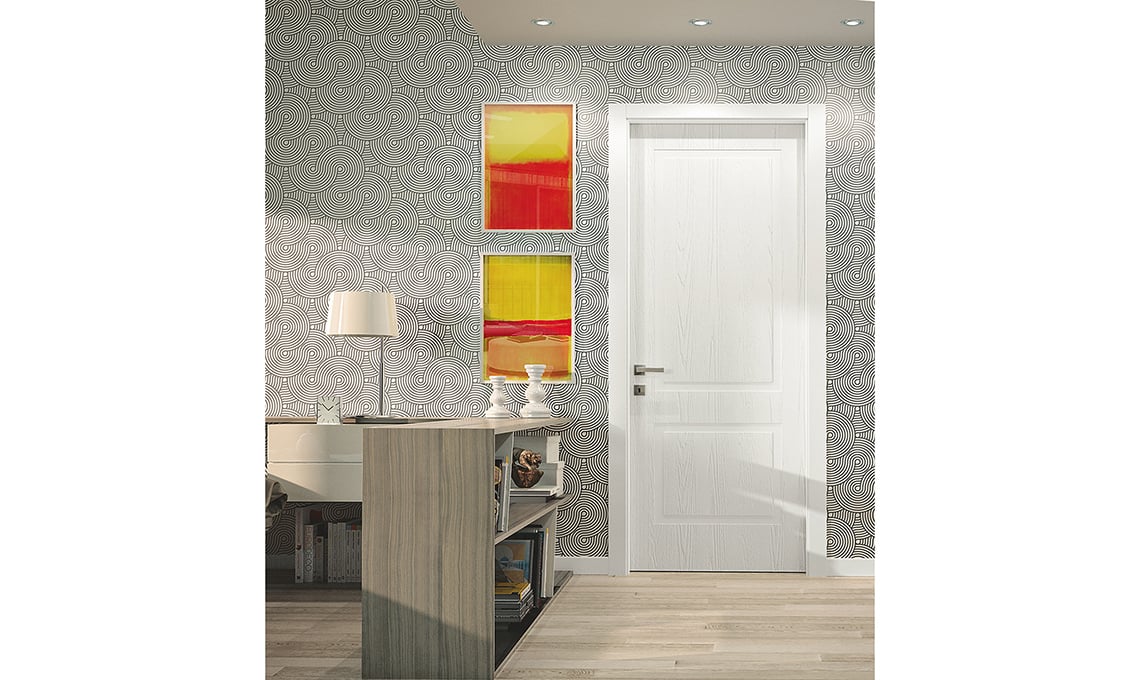 Porta in legno Nidio NR20, nella finitura Frassino laccata a poro aperto in Bianco Ral 9016 che mette in evidenza le fiammature del legno di frassino [Flessya,