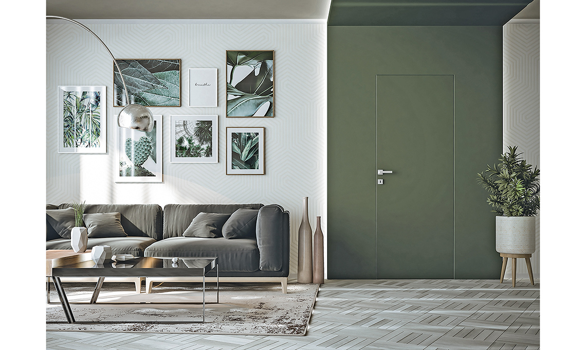Porta a battente pantografata Yncisa/0 della collezione Zero, qui con finitura ecosostenibile laccata Ultraopaco Metallo Dark,