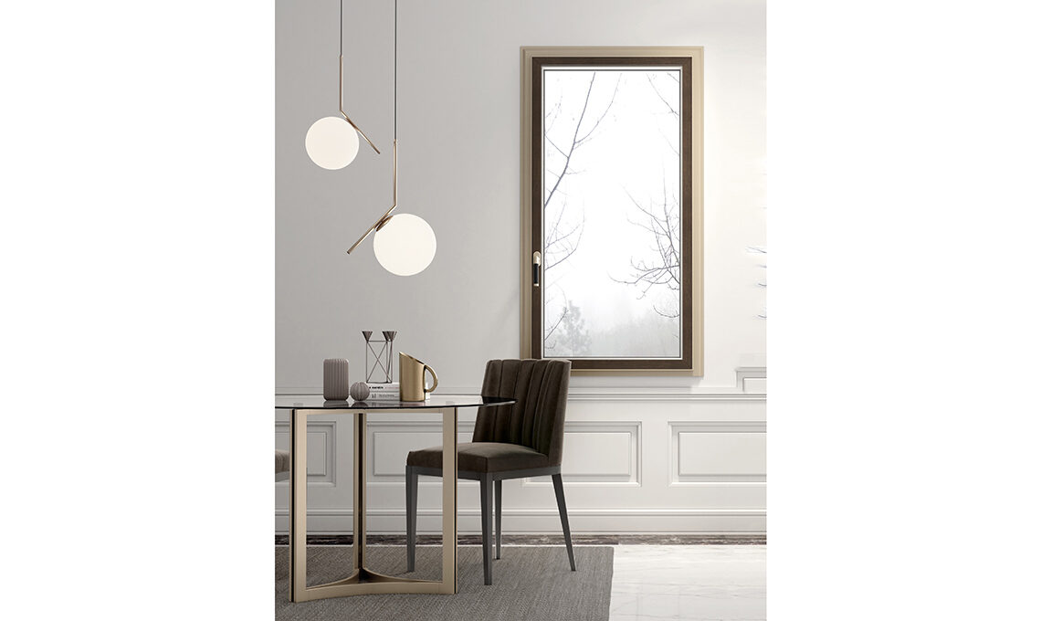Realizzata con il sistema alluminio- legno Starwood®, Oltreluce TT Intarsio è abbellita da una cornice formata dal profilo in alluminio al cui interno è inserito un profilo in legno massello [Orsolini, cm 80x140h prezzo su progetto].
