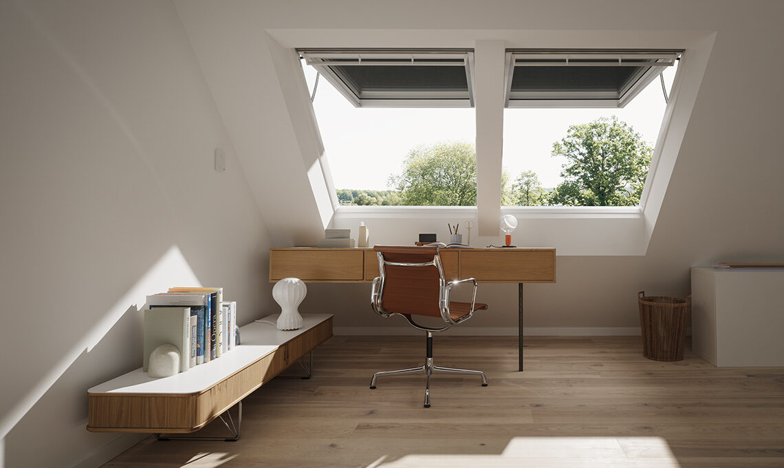 Dotata di doppia apertura, a bilico manuale e vasistas elettrica, la luminosa finestra da tetto GPU Integra è predisposta per l’installazione di tapparelle e tende manuali, elettriche o solari [Velux, cm 66x118h € 1.339,56 N.B. in foto, due finestre a doppia apertura].