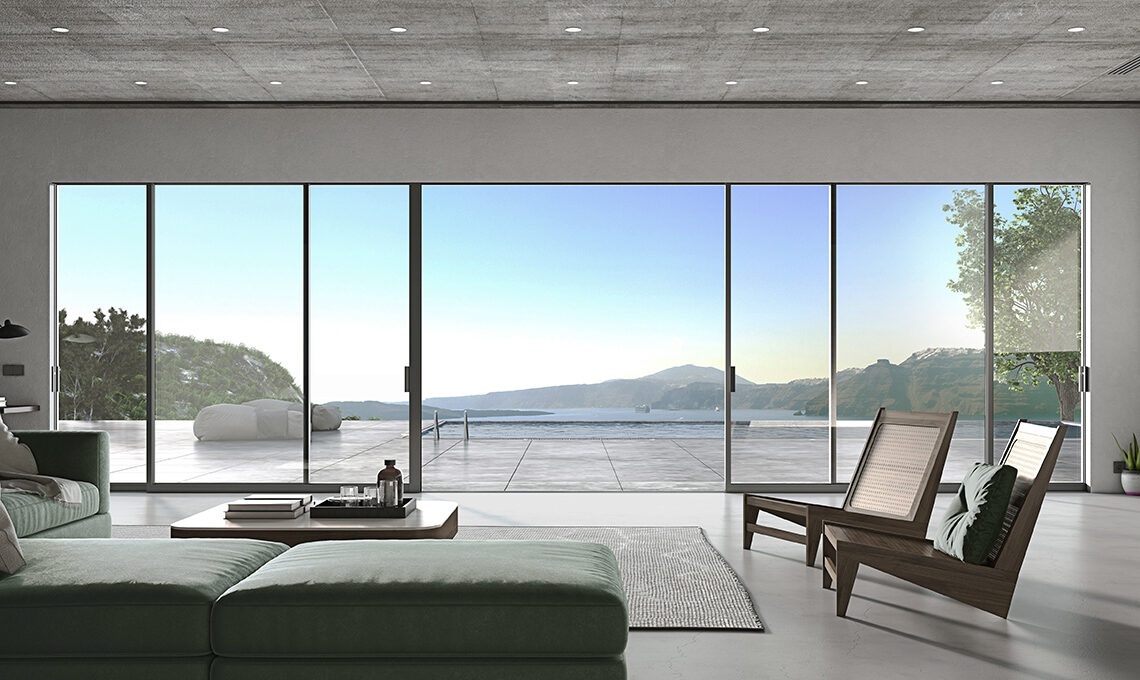 Nei sistemi scorrevoli i profili del telaio vengono incassati nel pavimento, nel soffitto e nelle pareti laterali, per nasconderli alla vista e dare l’impressione che le ante scompaiano nel telaio: l’obiettivo è di ridurre al minimo l’ingombro delle parti strutturali per lasciare maggiore spazio alle vetrate e all’ingresso di luce naturale, annullando così il confine tra in&out.