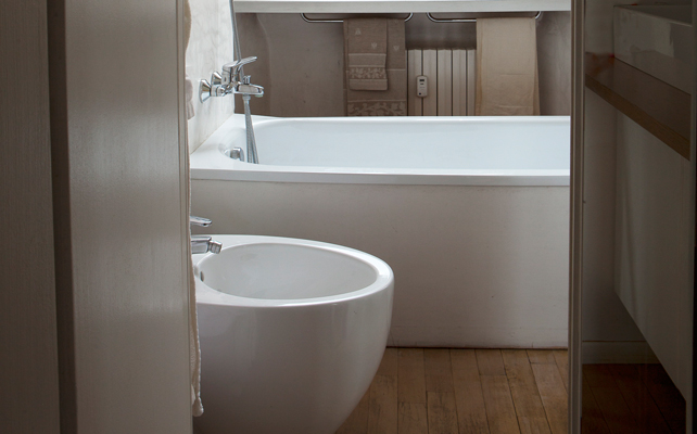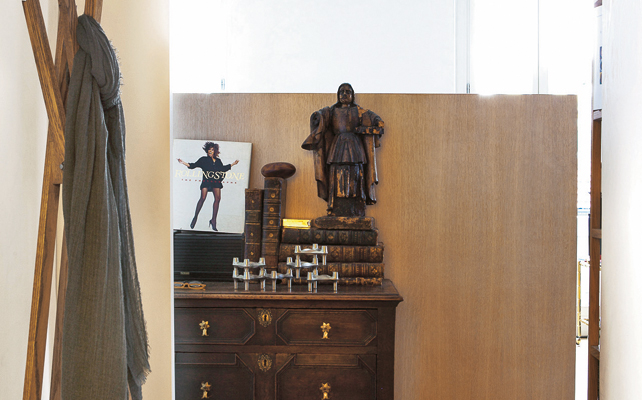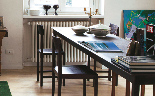 I locali di servizio sono neutri: cucina bianca a vista e mini-bagno con vasca. Il carattere del living invece sta nel contrasto tra legno chiaro e scuro, nei prototipi e nei ‘su misura’ di Plinio il Giovane, accanto ai mobili antichi. Mario – anche come parquet – ama il rovere, legno forte e duraturo che lui tratta tradizionalmente, con olio di lino e pigmenti naturali, dal gesso all’ossido di metallo.