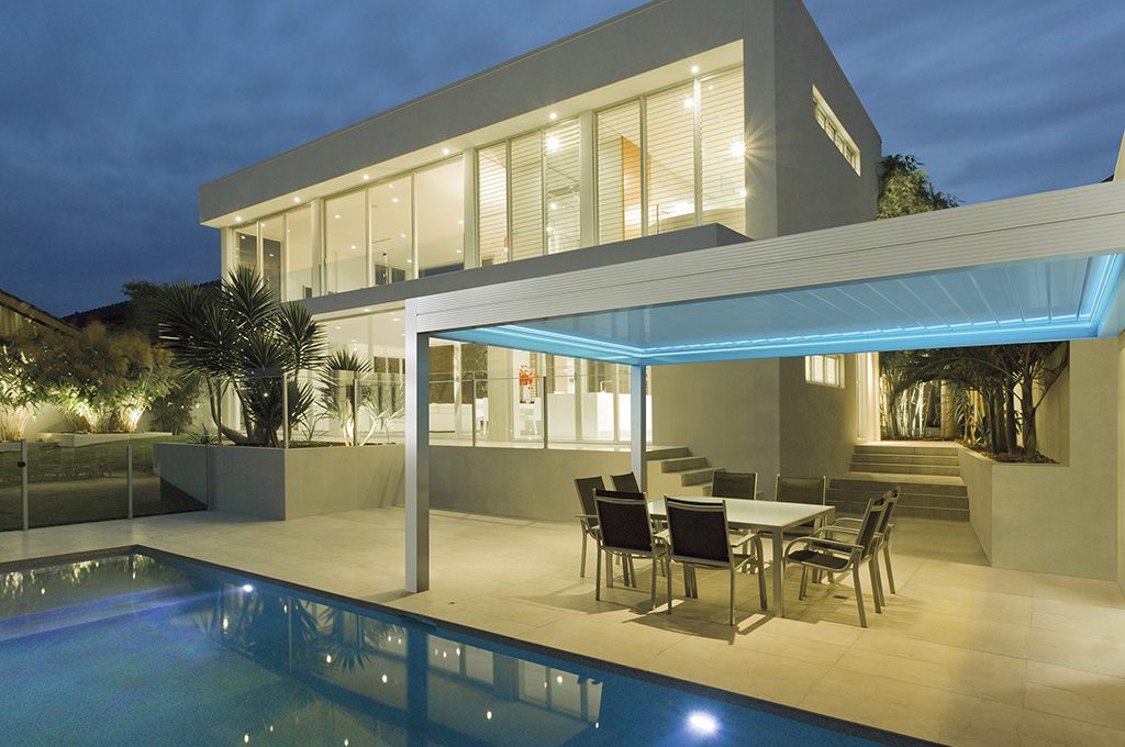 Pergola bioclimatica Med Twist, struttura portante in alluminio verniciato e dotato di lamelle movibili e orientabili per la ventilazione [Gibus, misure e prezzo su progetto].