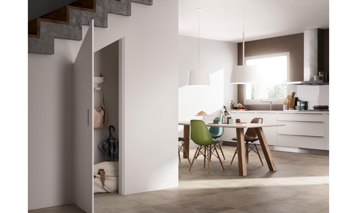 CHIUSURE PER IL VANO SOTTOSCALA Per ricavare un ripostiglio si realizza una parete in cartongesso e si adottano pannelli di chiusura dotati di telai integrati nel muro e di ante trapezoidali filomuro che, da chiuse, risultano invisibili. In foto, di 15-17 cm. In foto, sistema filomuro Skema [FerreroLegno, su progetto].