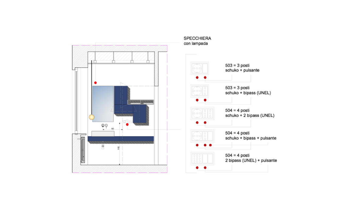 Nell’esempio (immagine nella gallery) trovi le varie possibilità che puoi adottare vicino al lavandino dove di solito si prevede luna presa di corrente e un interruttore per la luce dello specchio.