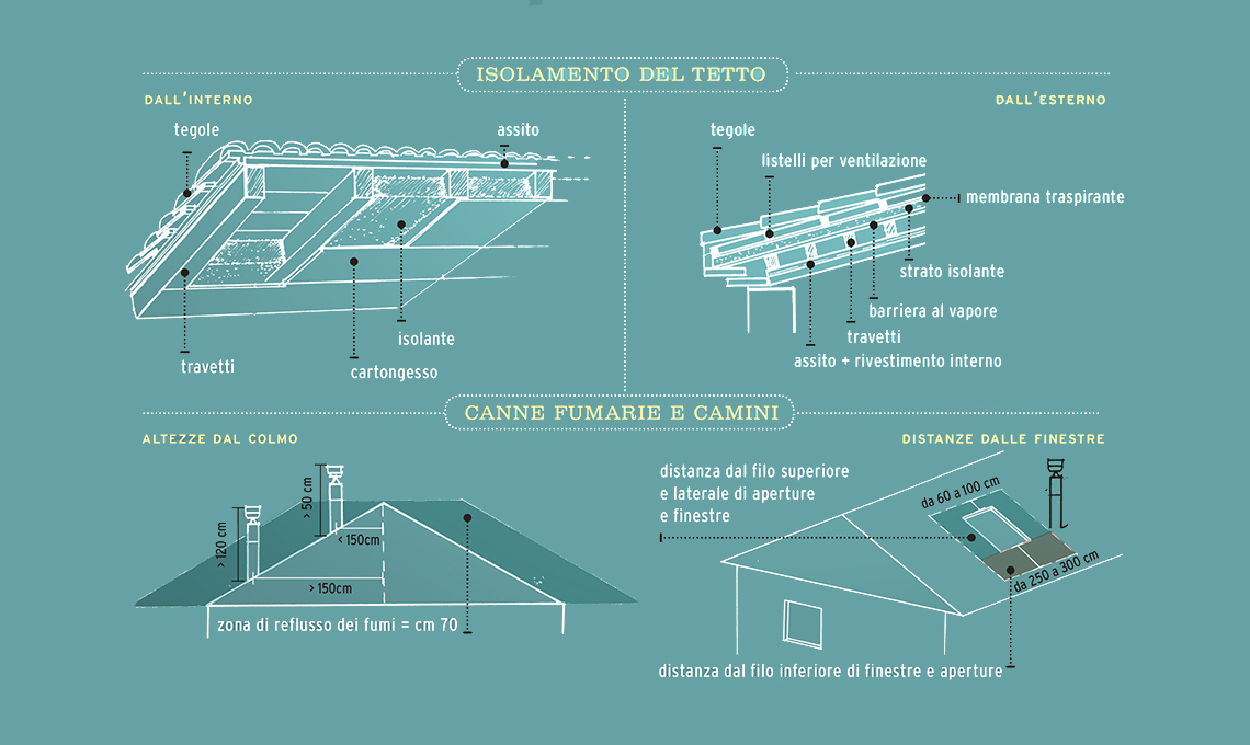Sfogliando la gallery, puoi vedere nel dettaglio i disegni tecnici che ti spiegano il 'pacchetto' isolante adatto al sottotetto abitabile e le misure da rispettare per l'installazione di camini e canne fumarie.