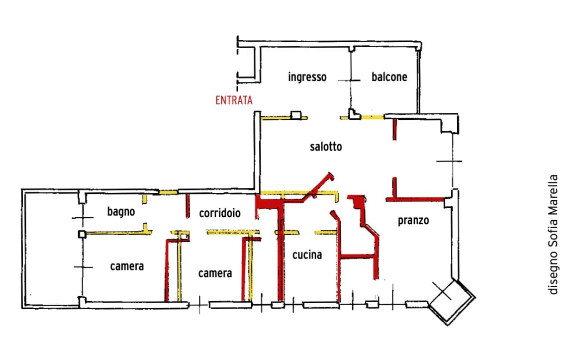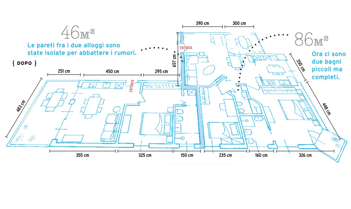 La nostra architetta CF style Susanna Raoha deciso di dividere in due l’appartamento di famiglia: su un totale di 132 mq ha ricavato un trilocale di 86 mq da tenere per sé (vive con marito e figlia) con due bagni, cucina separata e zona studio, più un bilocale di 46 mq da affittare.