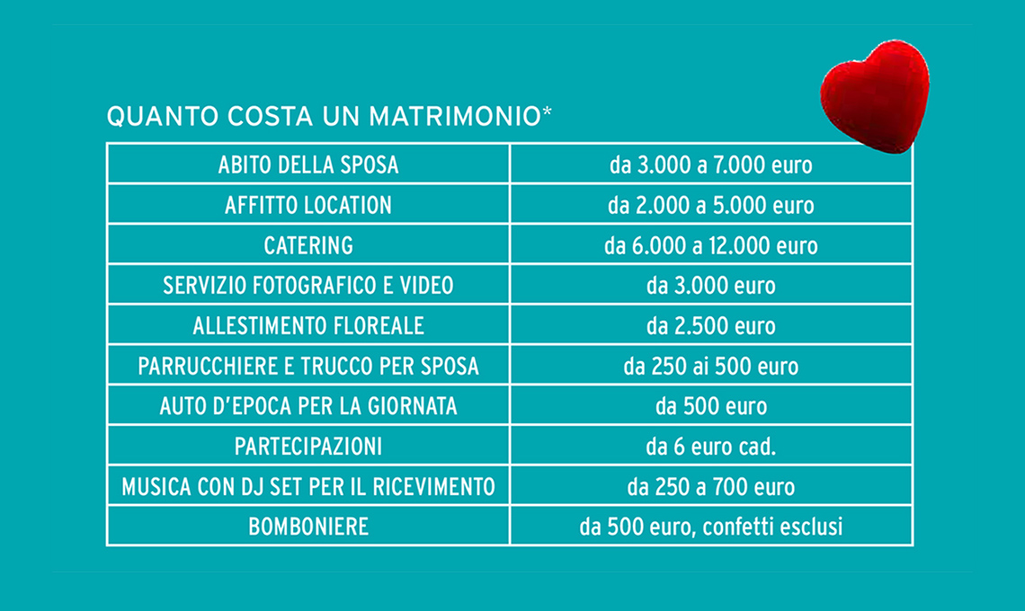 Sposarsi, però, comporta un notevole impegno: emotivo, organizzativo e, non ultimo, economico. Secondo Andrea Bettinzoli, wedding planner di Chapeau Consulting, «le voci di spesa da tenere sotto controllo, quando si affronta un matrimonio, sono davvero molte e variano da regione a regione oltre che, naturalmente, in base alla tipologia di cerimonia che si vuole organizzare. Per una cerimonia in stile tradizionale, con 80 invitati, si possono spendere da 3.000 a 7.000 euro per l’abito della sposa, fra 2.000 e 5.000 euro per l’affitto della location, fra 6.000 e 12.000 euro per il catering» (vedi tabella qui sotto).