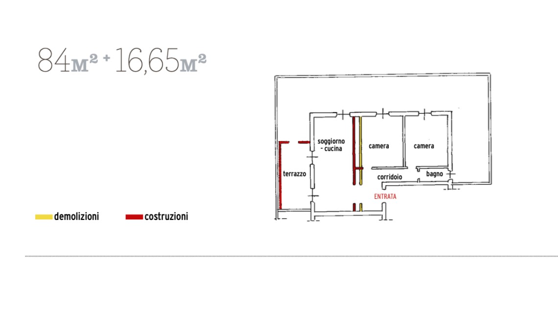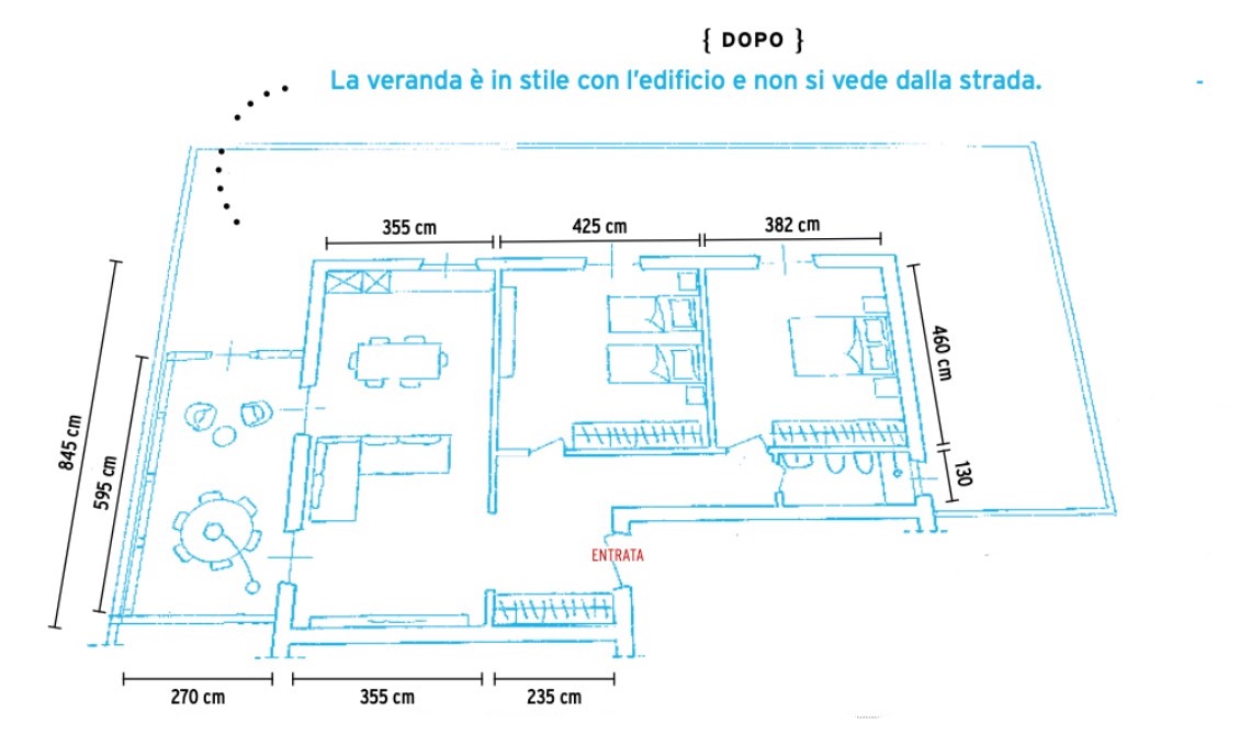 L’appartamento in origine era di 84 mq quindi, potendo a Genova aumentare la superficie abitativa del 20% la veranda è di 16,65 mq. Per garantire i rapporti aeroilluminanti, l’alloggio è stato ristrutturato ridimensionando il living e ingrandendo la camera da letto accanto.
