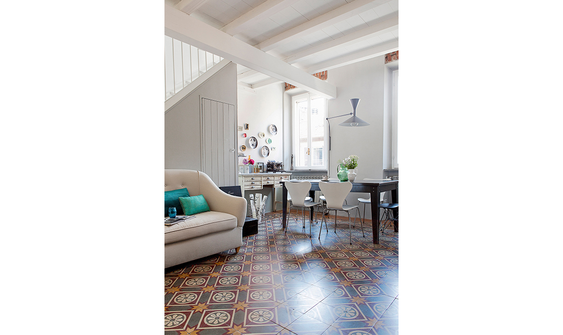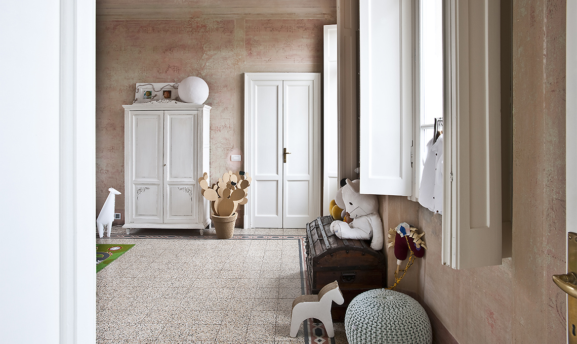 Cementine d'epoca per il pavimento e muri lasciati grezzi, con la traccia degli affreschi di una volta: a compensare le texture ruvide, il legno smaltato degli scuri alle finestre e la morbidezza del pouf. La ricetta dell'atmosfera negli interni è come in cucina: una consistenza morbida accanto a una "croccante"...