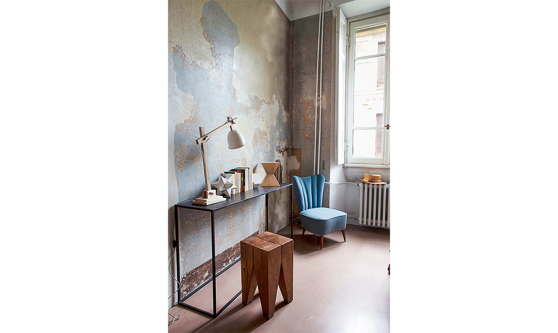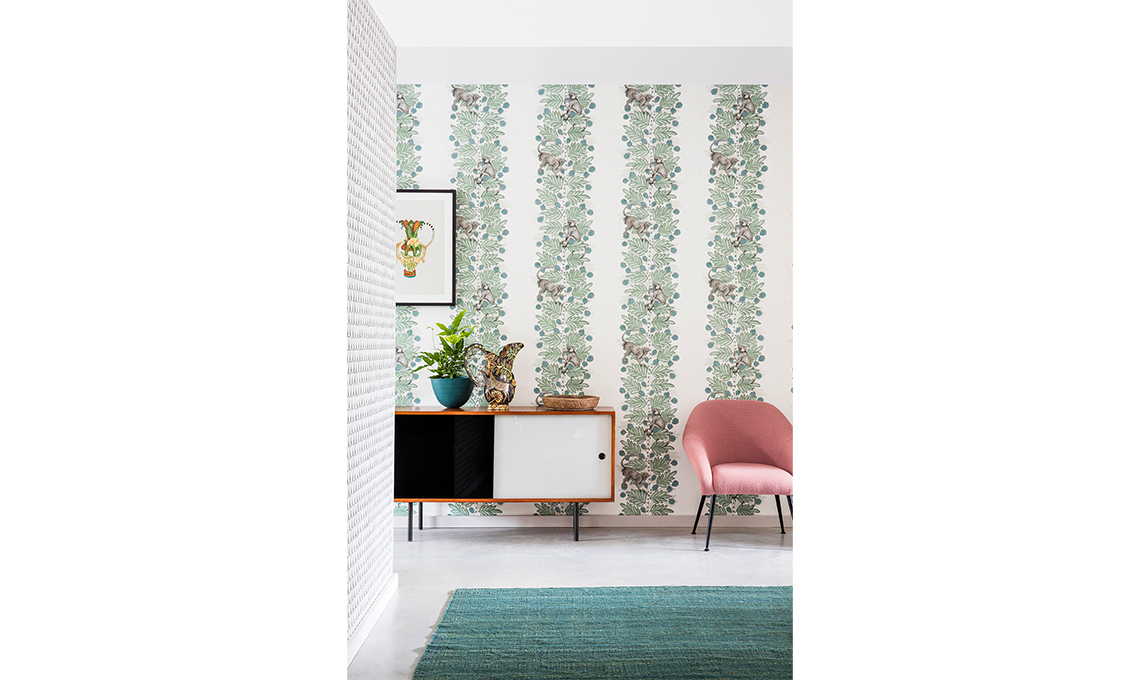 Qui la composizione parte da un elemento base: la carta da parati che decora rubando la scena. Un sideboard tricolore rivaleggia per importanza.
