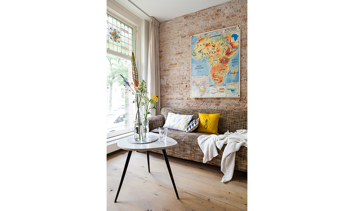 La parete in mattoni a vista impone un effetto "raw" che in questo caso è assecondato dal divano grezzo e "addolcito" dal tavolino laccato lucido e dalla tenda in morbido cotone.