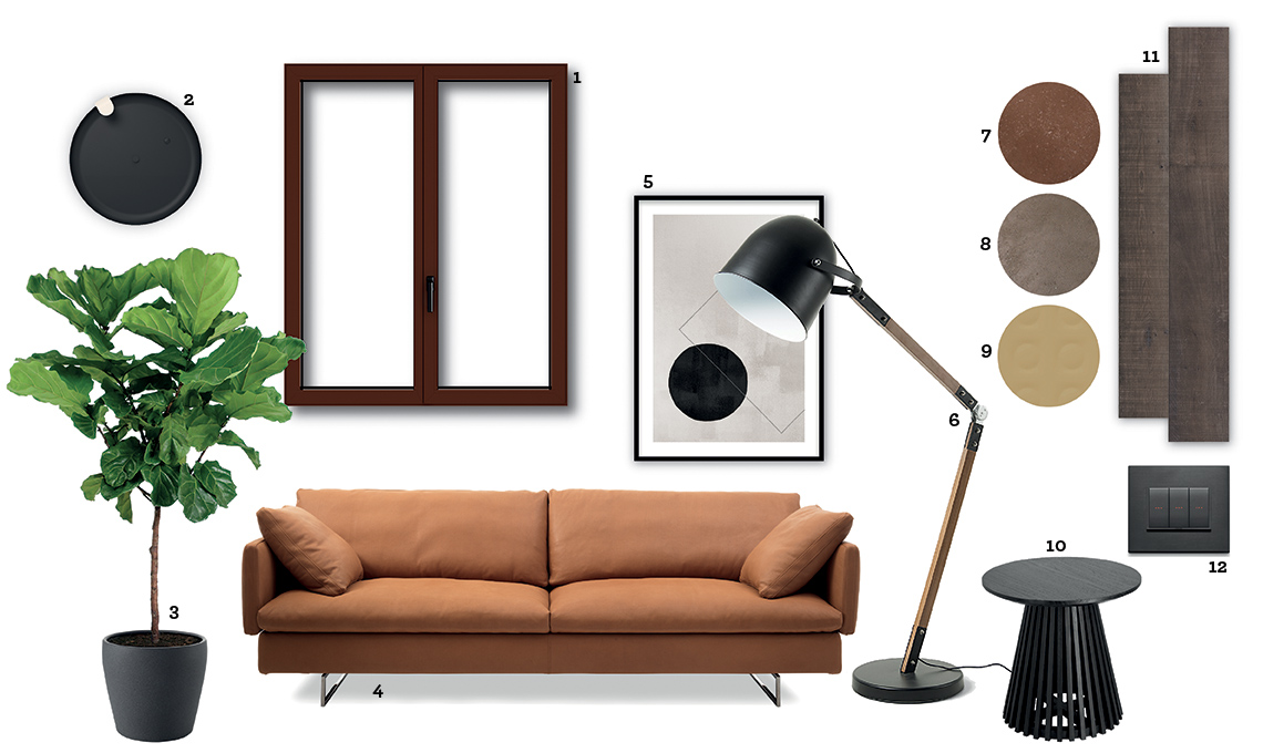 Per ricreare la giusto atmosfera nella stanza ho scelto di abbinare l'infisso Metropolis ad un parquet dal tono intenso, un divano dalle linee pulite ma confortevoli e dal colore caldo e accogliente. Per le pareti, tinteggiature dalle texture materiche e rivestimenti 3D per superfici che vibrano con la luce. Non possono mancare i complementi come una lampada da terra con il braccio mobile, un tavolino tondo con basamento che è una piccola scultura. Per completare lo styling inserisco un orologio nero, essenziale e ideale per scandire il tempo con discrezione, una stampa geometrica e placche con tasti total black che seguono il mood dell’intero ambiente. Non può mancare il tocco verde di una pianta dalle grandi foglie da inserire nel giusto porta vaso, che è fondamentale quanto la cornice per un bel quadro!