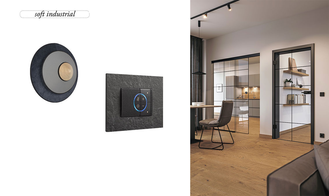 Porta LFT [Hörmann, cm 80x210h prezzo su progetto], lampada da parete Cymbal colore Midnite [Forestier, ø cm 34x16h € 325], comando vocale da incasso con Alexa, per impianti domotici [Vimar,
